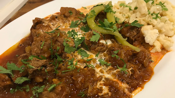 El plato de goulash presentado con la pasta, unas guindillas encurtidas y un poco de perejil fresco picado.