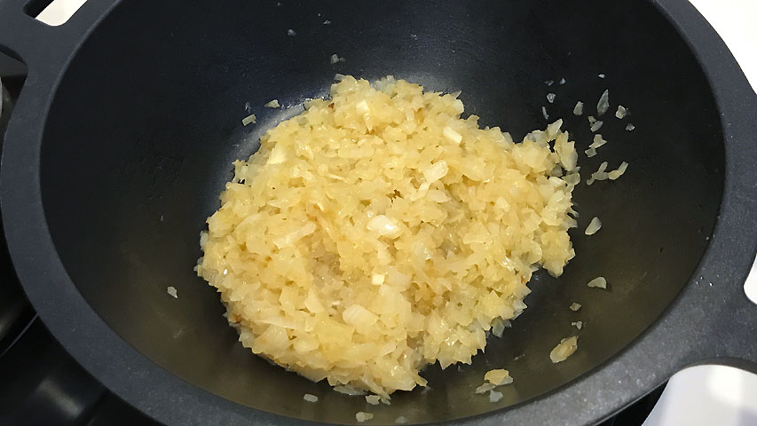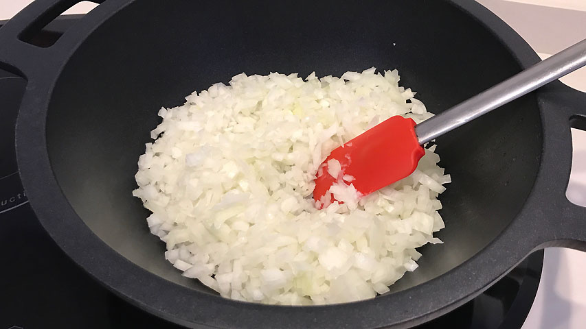 La cebolla bien picada (el mismo peso que la carne) se sofríe en la manteca a fuego medio.