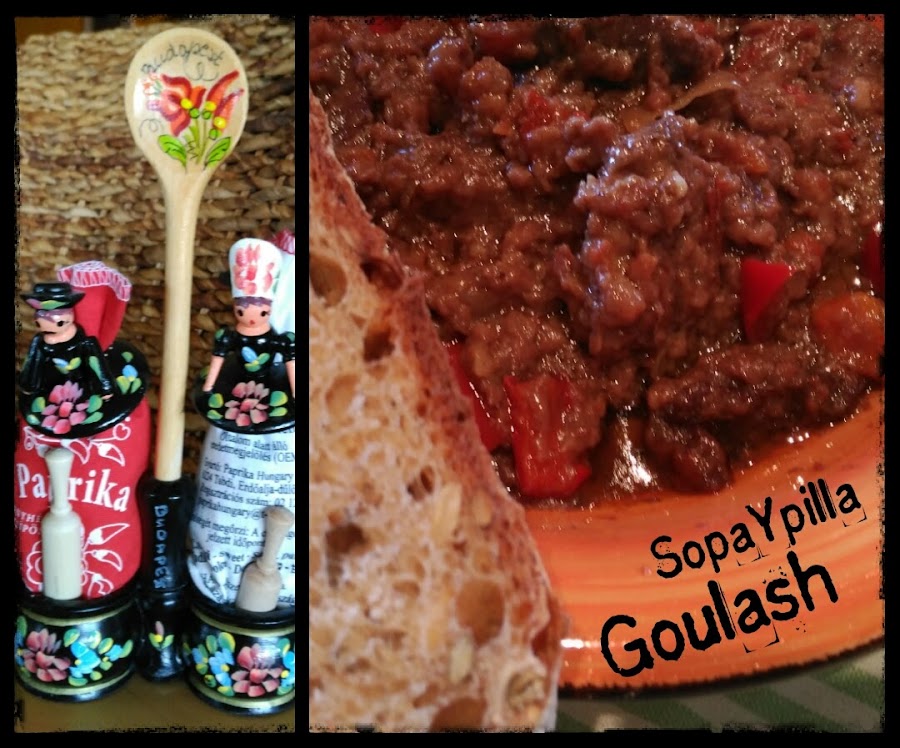 Hoy toca reponer calorías con un plato típico de Hungría, de pastores. Mi hermana viajó el año pasado a Hungría y me trajo de recuerdo un juego precioso de "paprika" (pimentón) que es el toque de este plato. Con el juego venía la receta en letra hiper minúscula, así que tenía que acabar en el blog segurísimo.