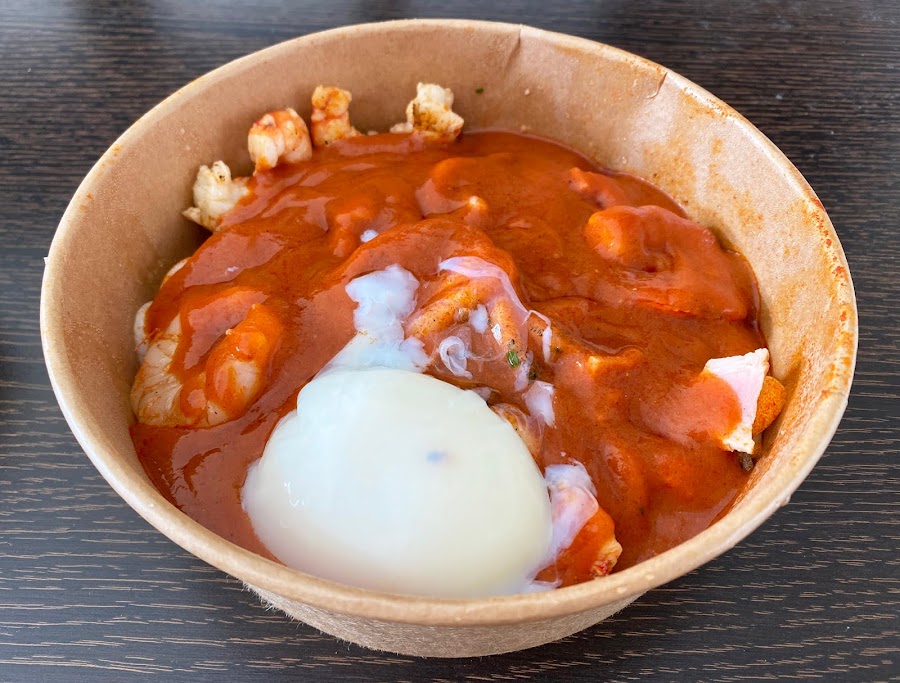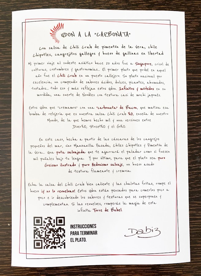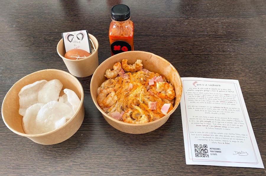 La salsa tiene una mezcla de chilli crab, que tiene un sabor muy intenso, con muchísimos matices, y de la carbonata de bacon, que mezclan también con el huevo asado que, al mezclarlo con la salsa, la hace mucho más cremosa aún. Es un plato espectacular y muy sorprendente.