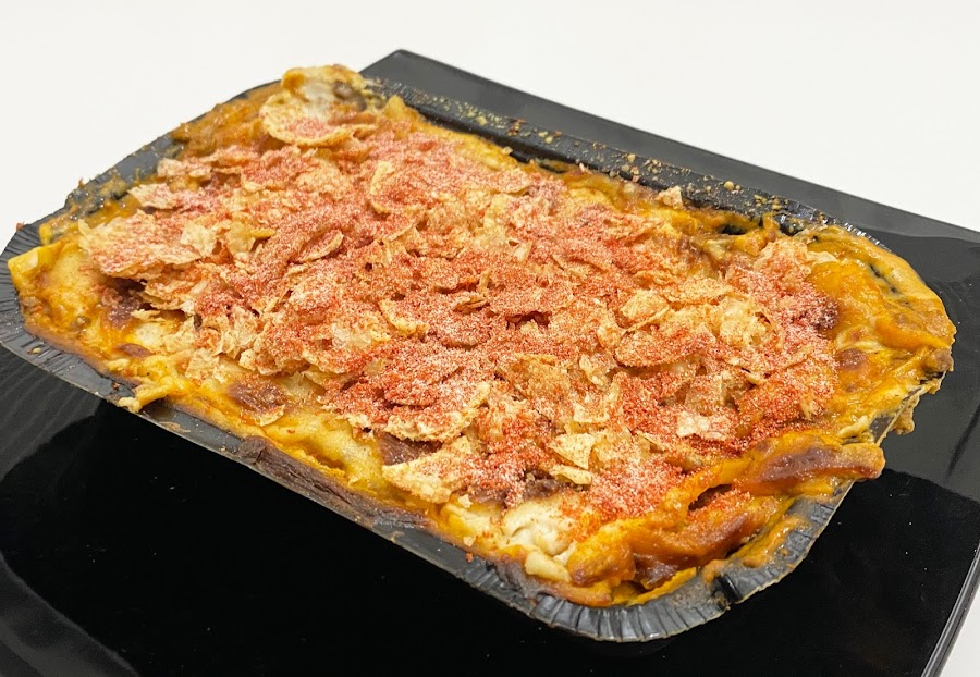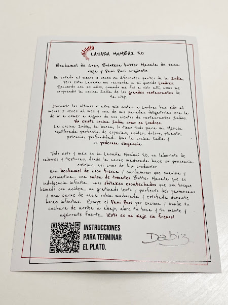El otro plato que pedimos la primera vez es la lasaña Mumbai XO, con bechamel de coco, boloñesa butter masala de vaca vieja y pani puri crujiente. Es un plato que también nos sorprendió bastante, ya que la boloñesa con curry tenía un sabor buenísimo que transportaba a un buen restaurante de la India, y al romper el pani puri y espolvorearlo sobre la lasaña, le da el toque final crujiente que hace de éste un plato espectacular.