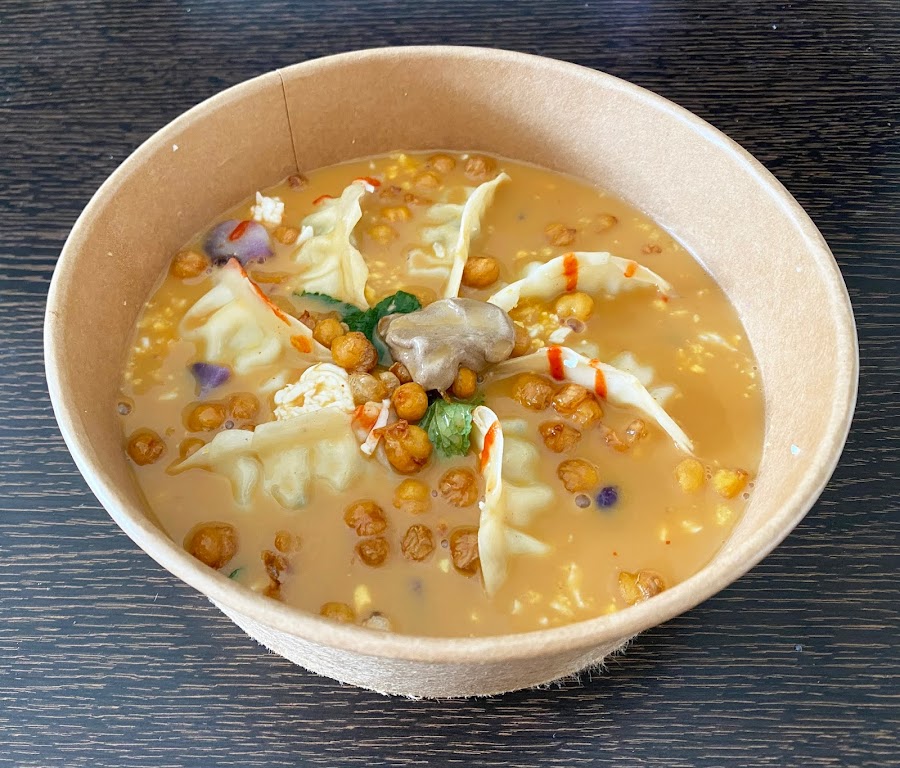Está hecho a fuego lento durante 48 horas con gallina vieja, huesos de jamón ibérico de bellota, verduras, garbanzos y una pasta de dulces encurtidos caseros. La mezcla con los dumplings, patatas moradas, alioli de ajo negro, col china, garbanzos crujientes y la picada de huevo duro, hace de este plato, junto con las costillas, nuestros favoritos de GoXO sin duda, una maravilla.