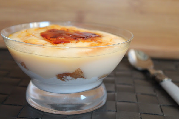 Mientras la crema se enfría, ponemos una cucharada de azúcar en la sartén con un poco de agua. Cuando el azúcar se haya disuelto, añadimos la copita de licor y emborrachamos los bizcochos.