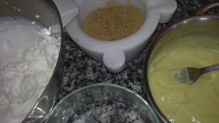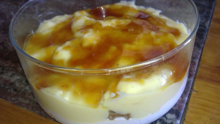 En una copa pon la nata (crema de leche). echa encima montoncitos de galleta triturada, añade la crema pastelera y decora con caramelo.