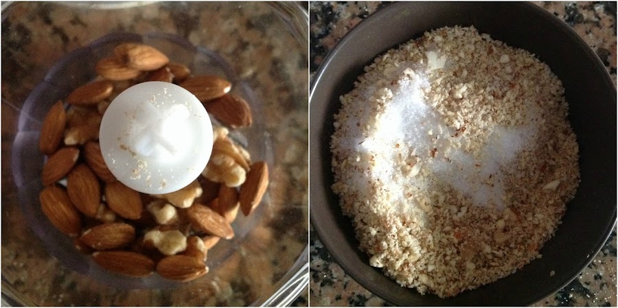 Mientras la masa descansa, preparamos el relleno, triturando las almendras y las nueces y mezclamos con el azúcar. Reservamos.