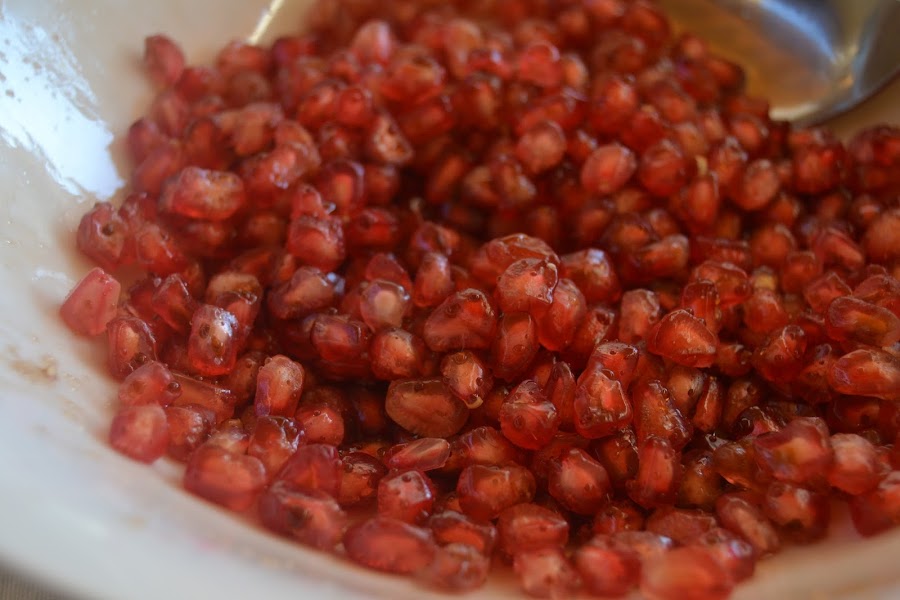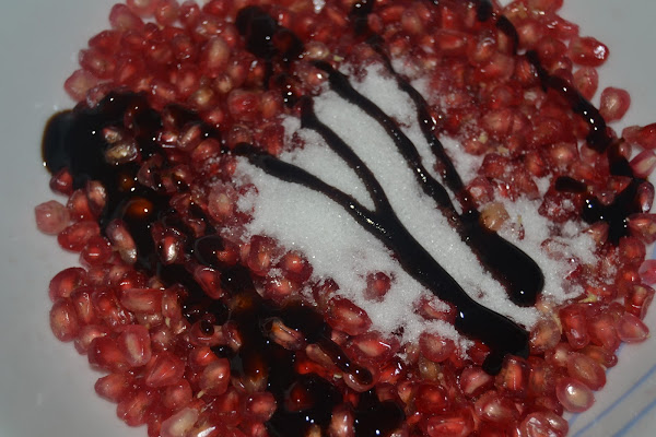 Pelamos las granadas y sacamos todas las semillas. le añadimos el azúcar y un buen chorreón de la crema de vinagre al PX.