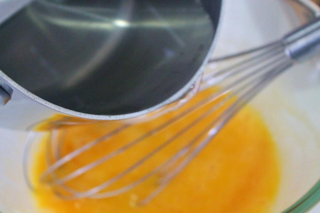 Ponemos las yemas en un bol y mezclamos removiendo el almíbar.