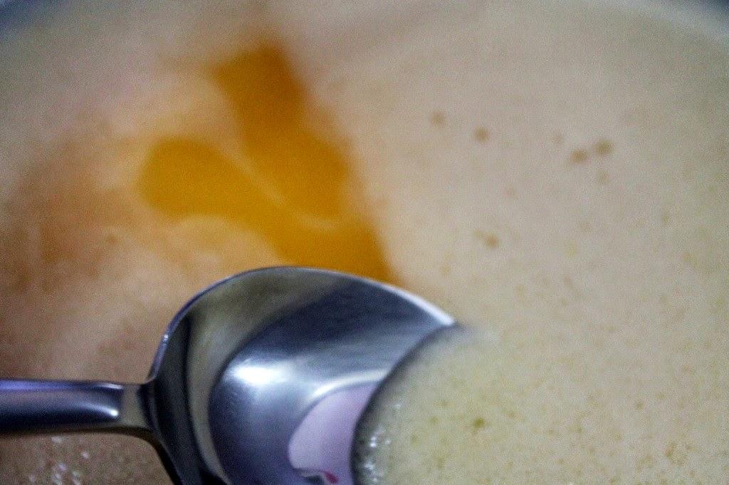 Se suele quedar una espumita arriba y es mejor colarlo si tenéis por una estameña y si no por un colador fino o también podéis quitarla con una cuchara.