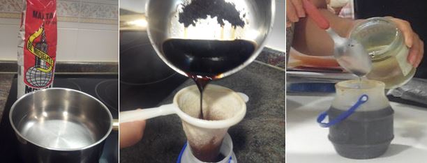 2.- Cuando la mezcla esté caliente, añadimos las cucharadas de malta y seguimos removiendo de 3 a 5 minutos, para llevarlo a ebullición, con cuidado de que no se salga del cazo.