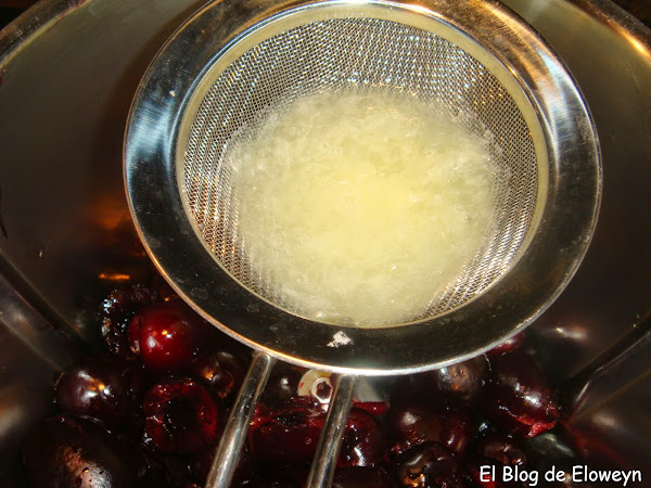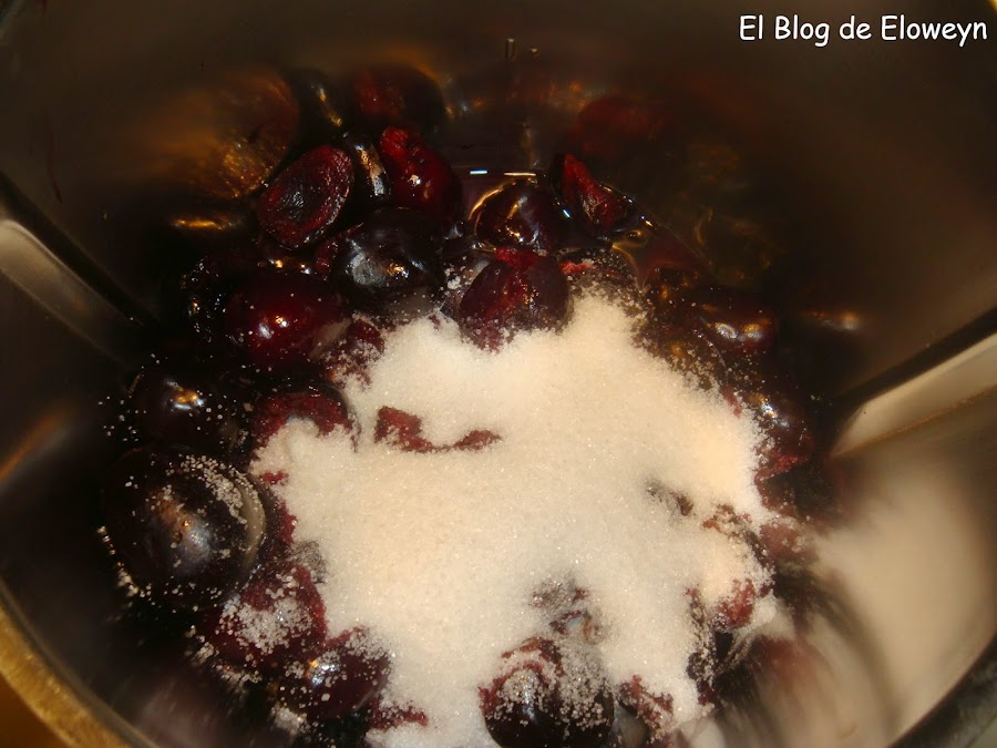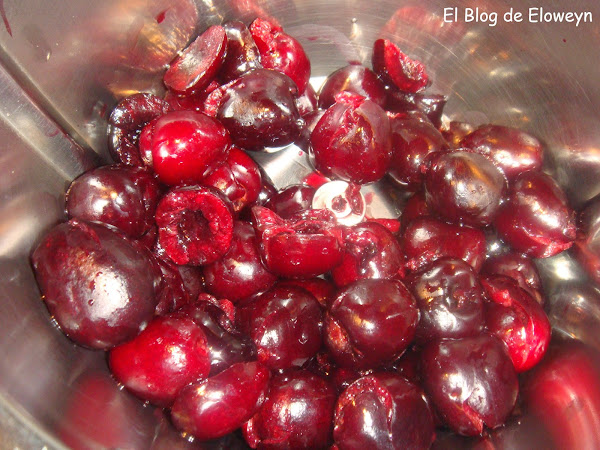 Quitar el rabito a las cerezas y lavarlas bien con agua fría. Una vez lavadas, quitar el hueso. Si no tenéis deshuesador de cerezas, en el post donde hago mermelada de sandía, fresas y cerezas a la menta os pongo un truquillo (Sí, otra vez menta... jajaja). Tienen que pesar unos 500 gramos sin hueso.