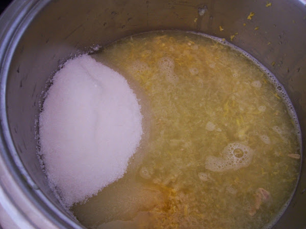 Ponemos la ralladura de limón, el zumo y el azúcar en una olla al fuego y cuando empieza a hervir lo dejamos 7 minutos.
