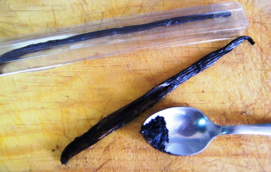 2. Cortamos la vaina de vainilla por la mitad a lo largo y sacamos las semillas con una cucharilla. Las añadimos al puré.