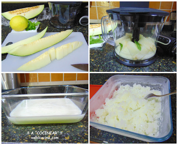 Le llamemos como le llamemos, ( ya que se tiende a utilizar un nombre u otro indistintamente ), .. hoy prepararemos un sencillo y delicioso granizado o sorbete de melón con limón y un ligero toque de hierbabuena, que seguro gustará a todos.