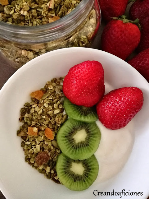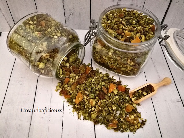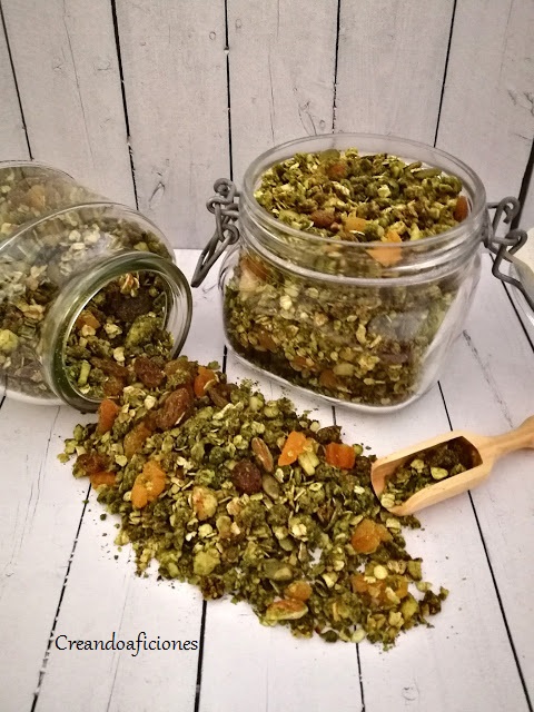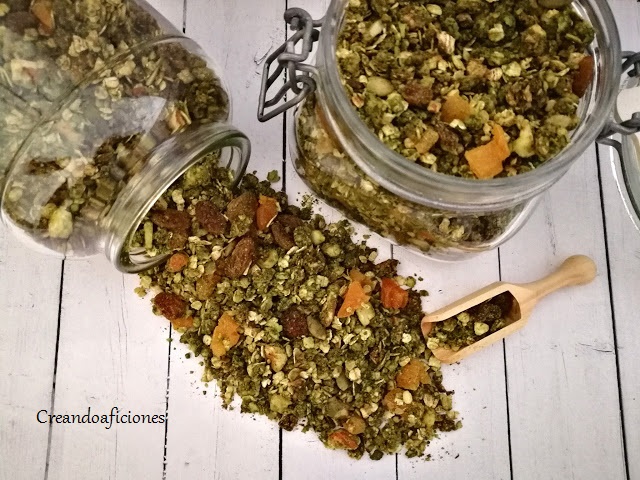Volvemos a preparar otra vez granola casera y esta vez con té matcha por todas sus propiedades. Los frutos secos es mejor que sean crudos, los podéis poner con el fruto seco entero o triturarlos. Es mejor que las frutas deshidratadas las pongáis al final, una vez que saquéis la granola del horno y lo mezcléis todo, así evitamos que se puedan quemar o se resequen. Las proporciones que yo suelo poner, es un puñado de pasas y unos 6 orejones cortados en trozos. Para que se conserve bien nuestra granola guardarla siempre en recipientes herméticos y así os dure unas cuantas semanas. Empezamos.