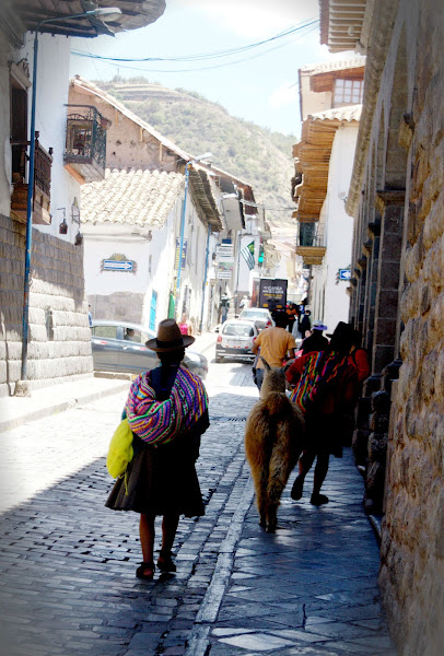 Mujeres cuzqueñas con llama por las calles de Cuzco