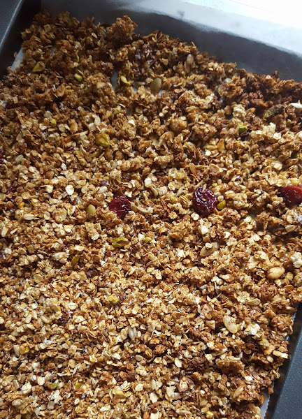 5. Horneamos la granola a 160º unos 20-25 minutos, removiendo con la ayuda de un tenedor a mitad de tiempo para que no se apelmace.