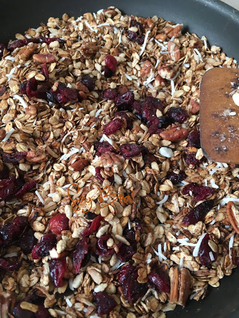 Dejamos enfriar la charola sobre una rejilla y luego picamos las nueces a gusto le incorporamos los arándanos, las demás semillas que ya vienen preparadas y espolvoreamos la canela en polvo.