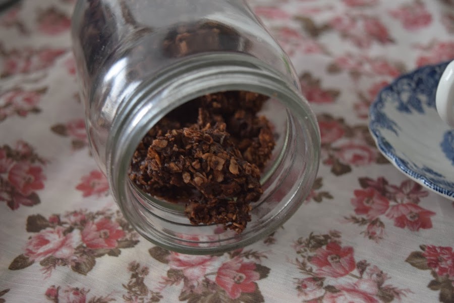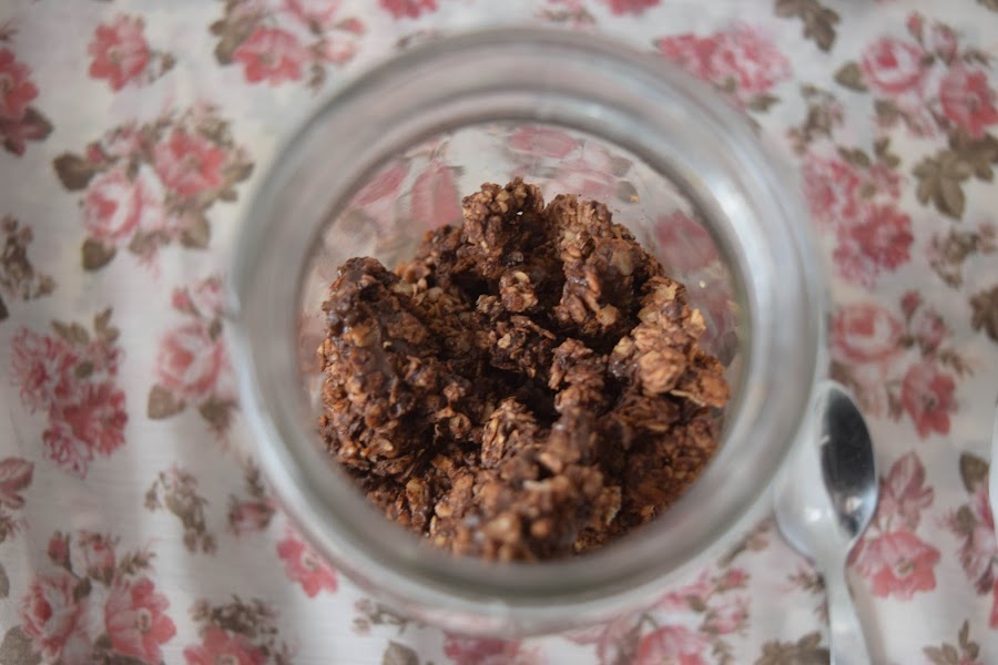 Yo los chips de chocolate los eché cuando la granola todavía estaba un poco caliente así se fundieron y se hicieron "bolas" de granola. No es el mismo como si los copos estuvieran recubiertos de chocolate, pero en cierta manera se parece.
