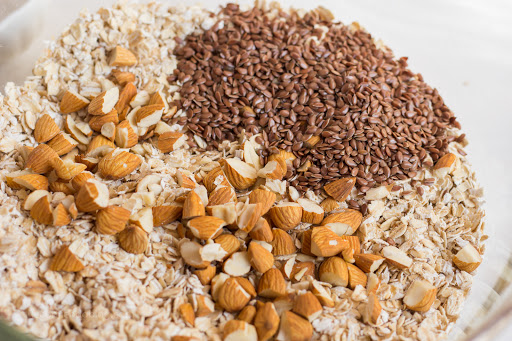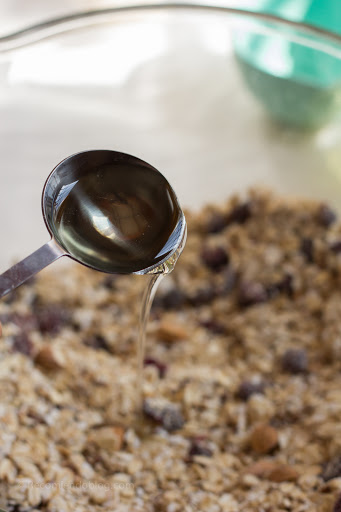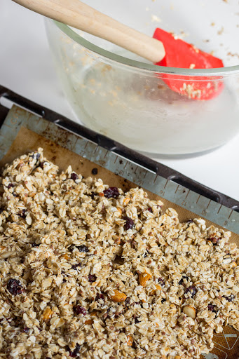 En un bowl, mezclar todos los ingredientes secos (avena y frutos secos) y luego añadir el aceite y la miel. Incorporar todo muy bien, con ayuda de una paleta de silcona o cuchara.