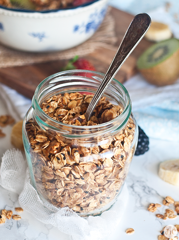 Me he decantado por acompañar los copos de avena con sésamo negro, nueces y avellanas, pero seguro que vosotros encontráis otros acompañantes deliciosos con los que convertir la granola en vuestra granola. Yo además lo he servido con diferentes frutas, como frutos rojos, plátano o kiwi, para acompañar el toque crujiente de la granola.