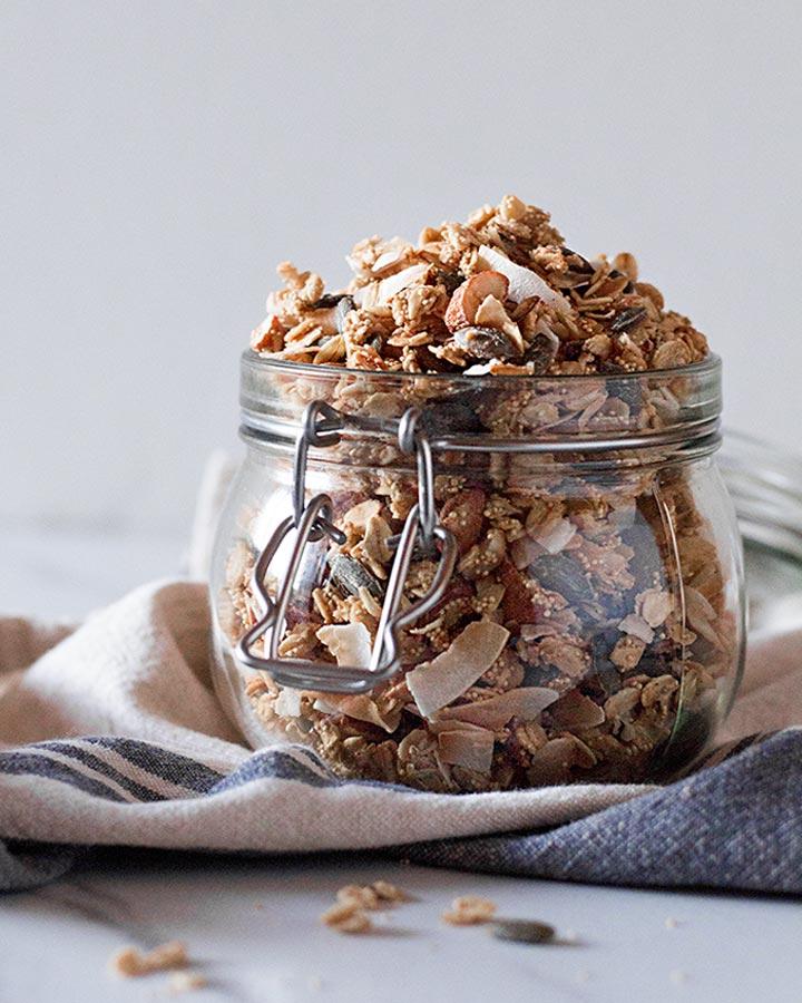 Para esta granola he utilizado avena, amaranto, almendras, pipas de calabaza y coco. Estos son los ingredientes que a mí me parecía que mejor pegaban con el sabor de la compota de manzana, pero podéis utilizar otros frutos secos, añadir alguna especia como la canela y darle ese toque personal para que se convierta en vuestra granola casera favorita.