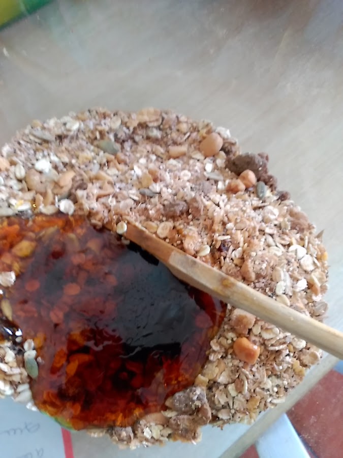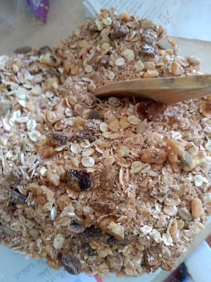 Mezclar todo bien en un bol excepto el coco y las pasas, la miel y el aceite. Añadir el aceite y la miel y volver a mezclar muy bien.