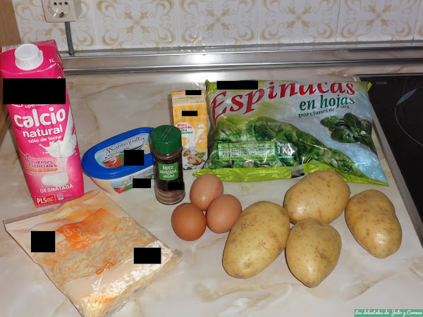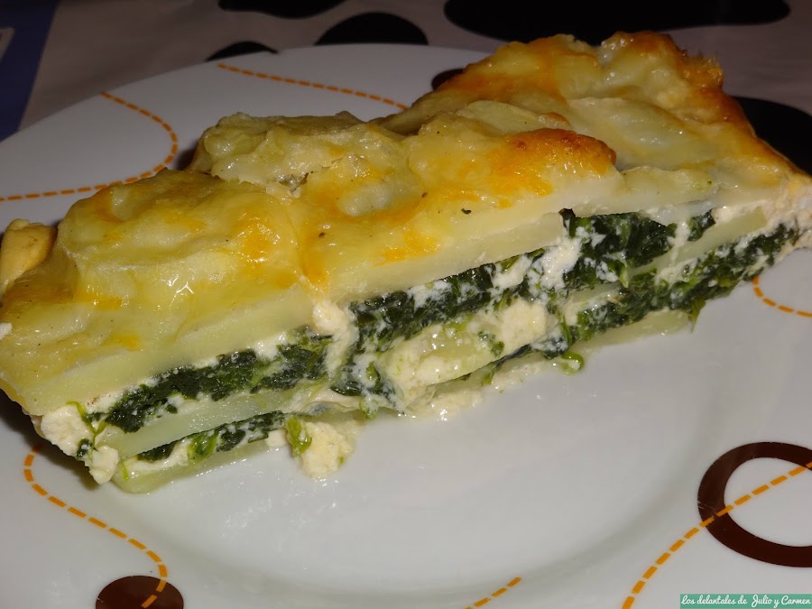 Engrasamos un molde apto para horno con mantequilla y pondremos una base con las patatas cortadas, y encima una capa de espinacas. Cubriremos nuevamente con una capa de patata y de espinacas, para acabar con una última de patata.