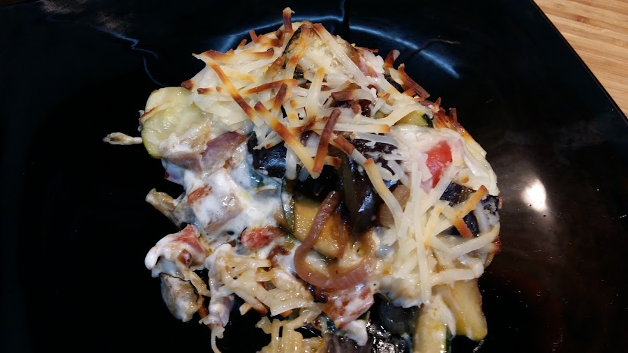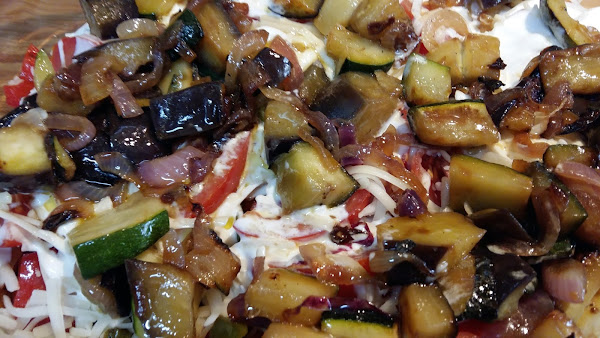 1 berenjena, 1 calabacín, 1 pimiento rojo, 1 pimiento verde, 2 tomates, 3 cebollas rojas pequeñas o 1 grande, 100 ml de nata (crema de leche) líquida, queso de oveja rallado, aceite de oliva, sal y pimienta molida.