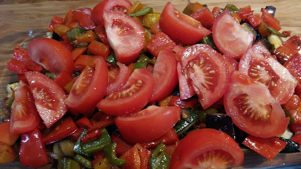 Cortamos los tomates en gajos y los colocamos crudos por encima.