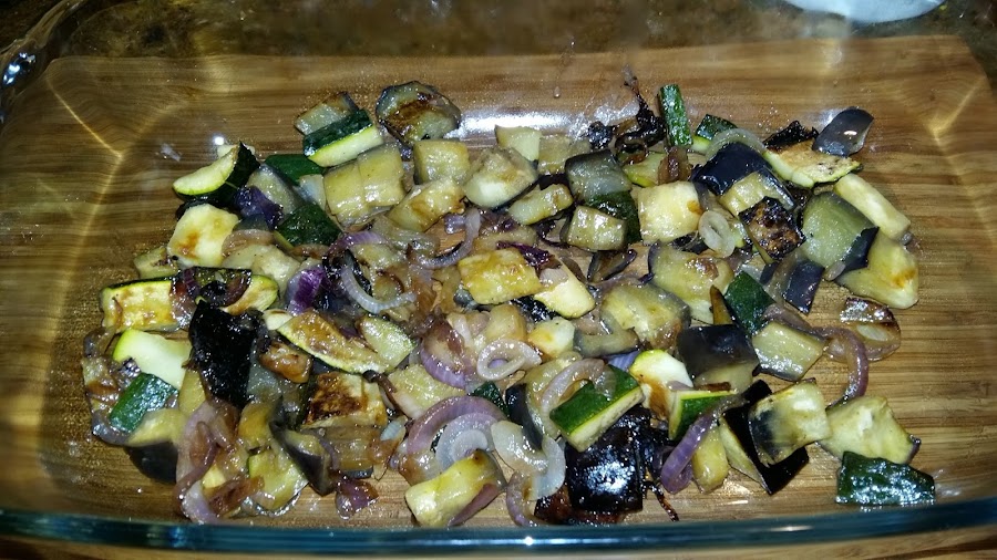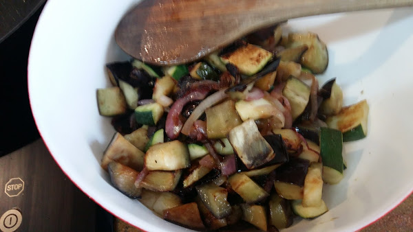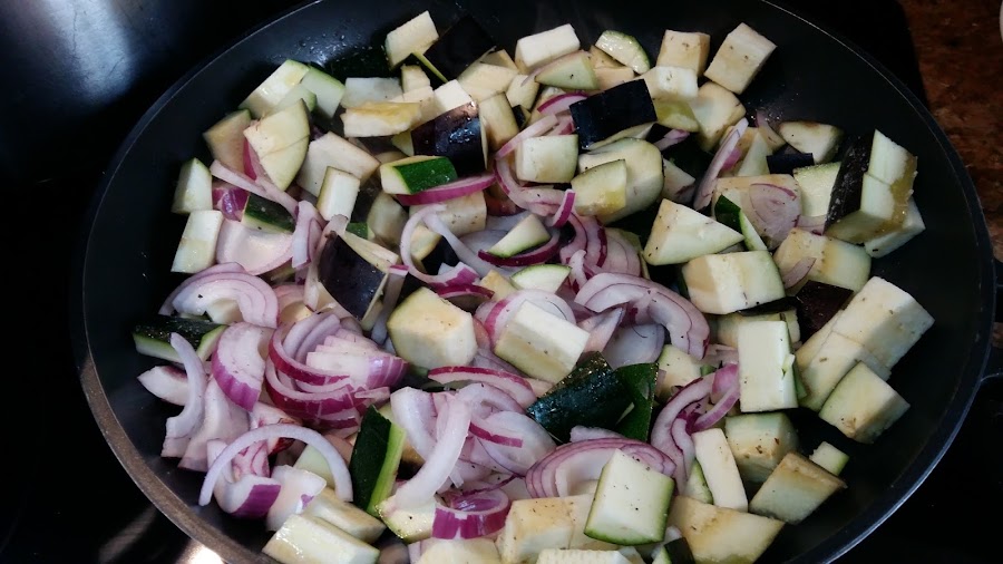 Lo primero que te recomiendo es que tengas todas las verduras cortadas, por lo menos las primeras, berenjena, calabacín y cebolla y así mientras se hacen vas cortando las otras.