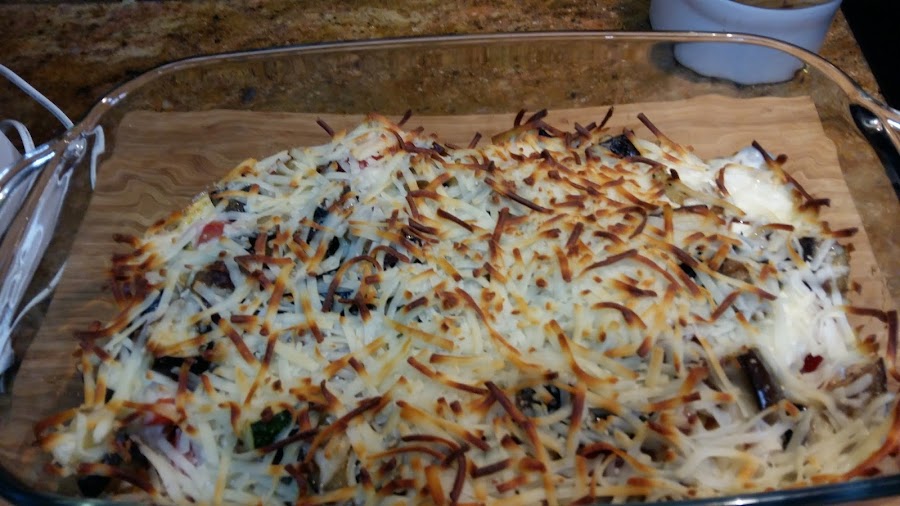 Ponemos en una fuente de horno la mitad de la mezcla de berenjena, calabacín y cebolla.
