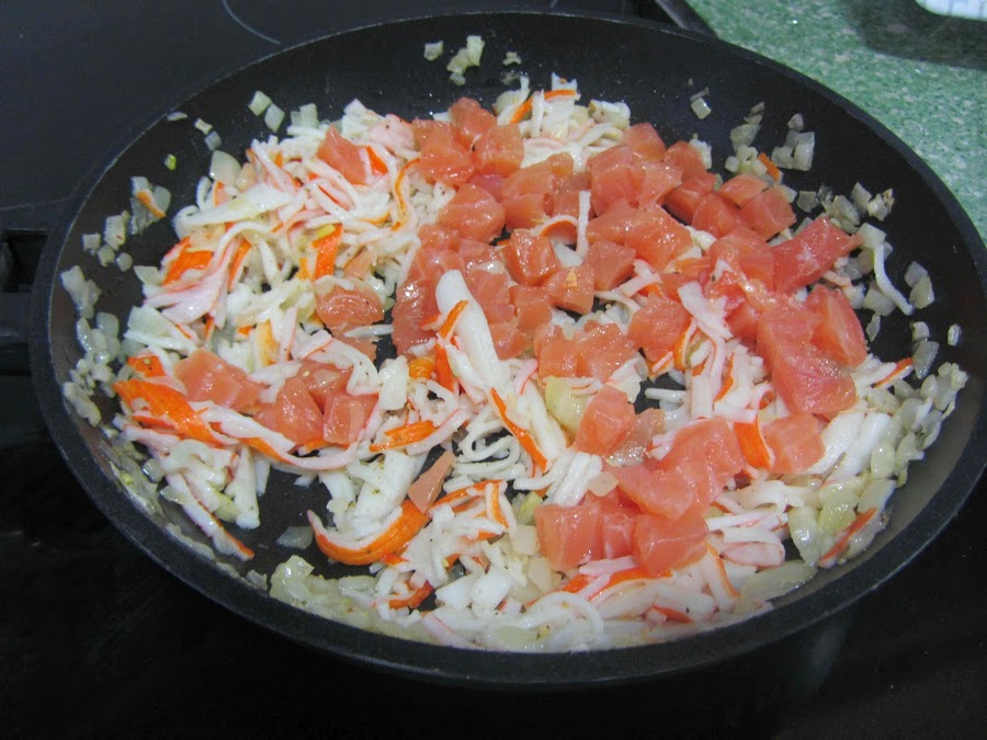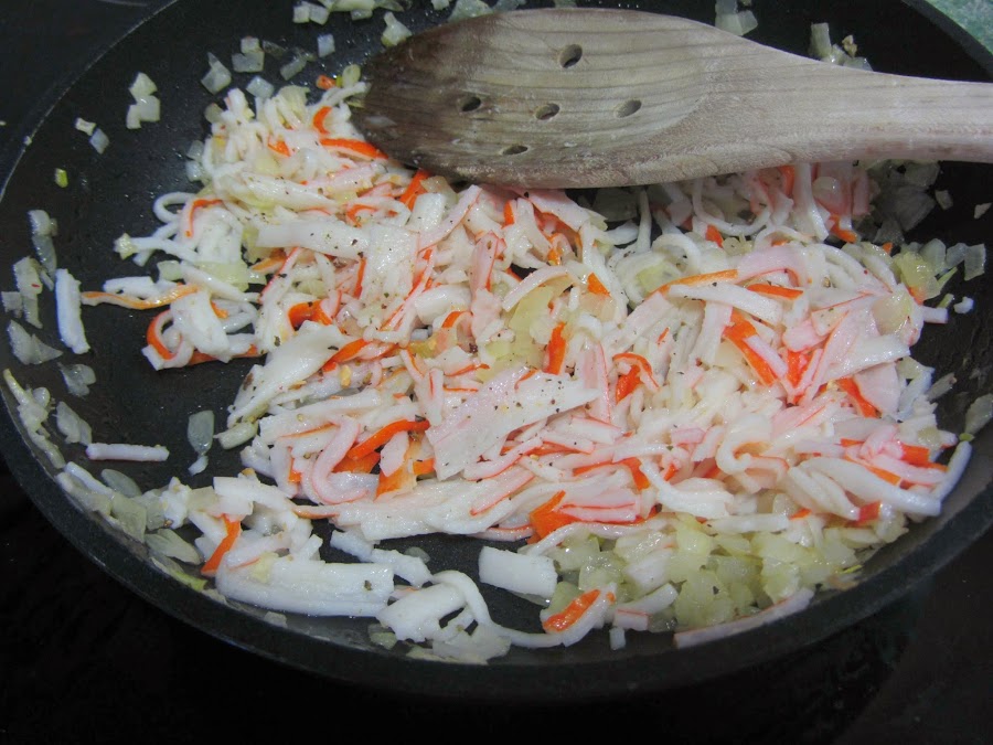 Cuando se vaya quedando transparente y blandita, agregamos los palitos de surimi, cortados en hilos (en la Thermomix se hace muy fácil: basta con ponerlos en el vaso y programar 6 segundos, velocidad 4 CON GIRO A LA IZQUIERDA. Y, a mano, los cortaremos en rodajas finas, y ellos solos formarán hilos). Salpimentamos, y rehogamos durante unos minutos.