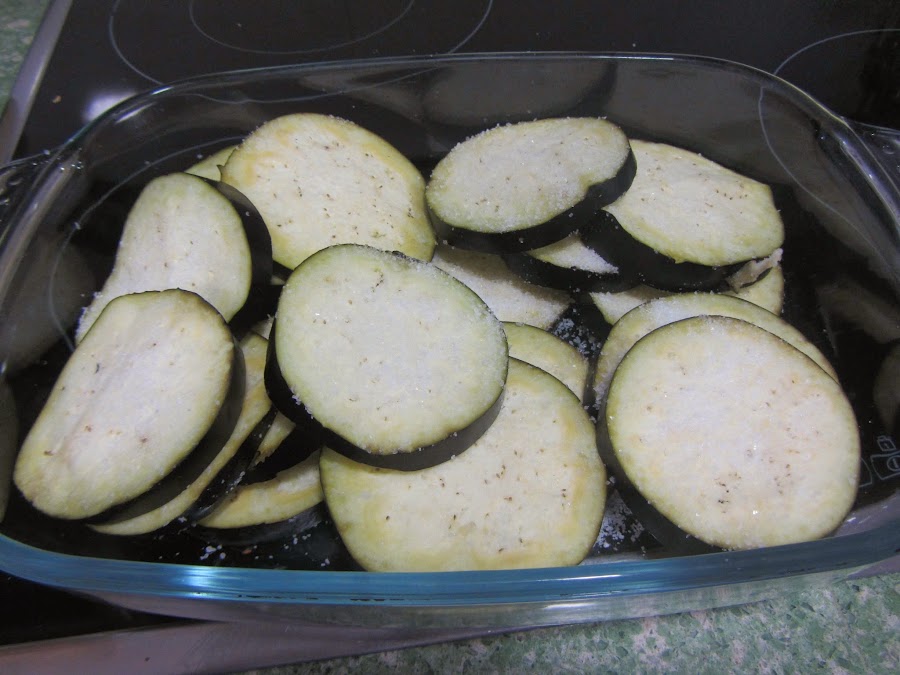 Cortamos las berenjenas en rodajas de ½ cm aproximadamente, y las colocamos en una fuente, bien cubiertas de sal gorda, entre ½ y 1 hora. De este modo, perderán el amargor.