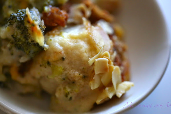 Añadimos los ramitos de brécol a la bechamel y cocinamos durante unos 20 minutos o hasta que esté tierno. Machacamos el brécol con un tenedor para terminar de integrarlo con la bechamel (añadiendo un poco más de leche para aligerar la mezcla si es necesario), añadimos la mitad del queso, sazonamos con sal y pimienta negra molida, mezclamos bien y reservamos.