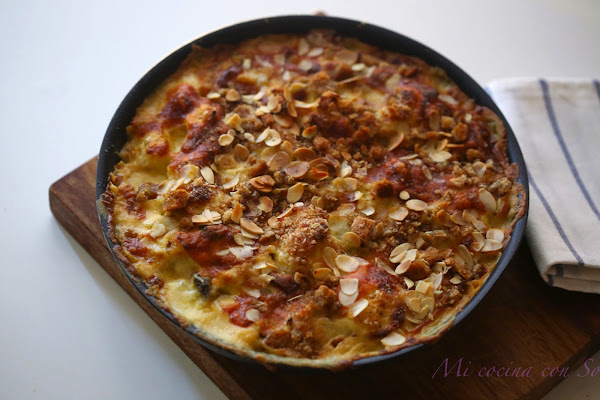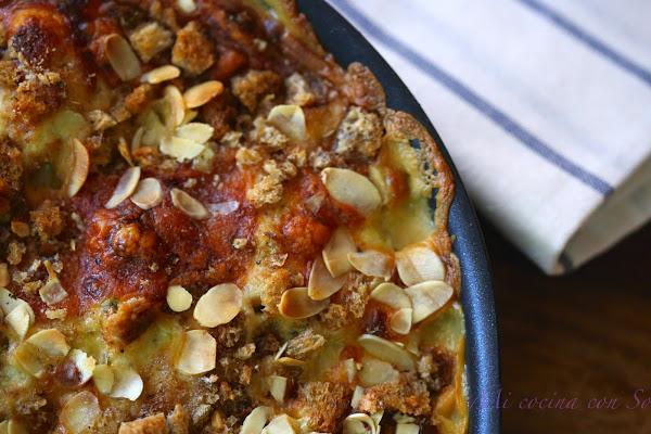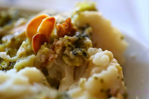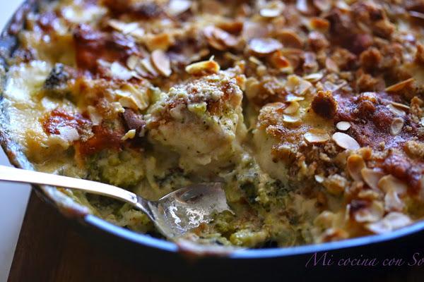 En una fuente apta para el horno disponemos los ramitos de coliflor, echamos por encima la mezcla de bechamel con brécol y espolvoreamos con el resto del queso. Añadimos por último los trozos de pan, las almendras laminadas y el tomillo, regamos con un hilo de aceite de oliva y metemos en el horno durante una hora o hasta que esté tierno y dorado.