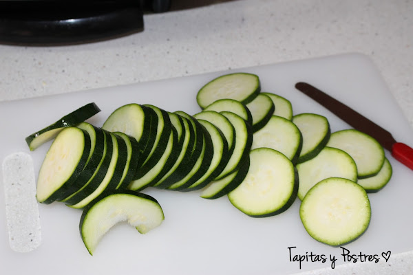 Lavamos el calabacín, le quitamos los extremos y lo cortamos en rodajas no muy finas. Las blanqueamos cinco minutos en agua hirviendo. Escurrimos.