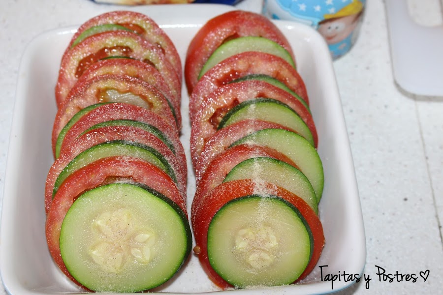 Pincelamos una fuente con aceite y colocamos el tomate y el calabacín alternando las rodajas. Salpimentamos.