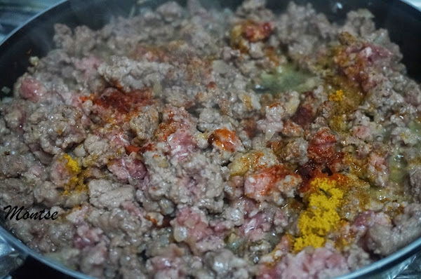 En esta ocasión he utilizado con la carne, especias, me gusta el curry y el sabor que le da, pero si no os gusta, también lo podéis hacer con un buen sofrito de tomate y cebolla, solo hay que buscar lo que más les pueda gustar.
