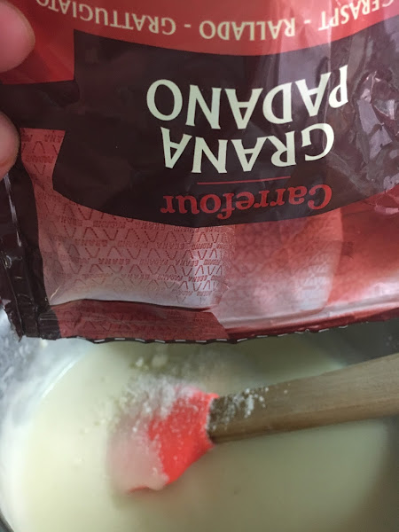 Se sala y se va probando la textura de la bechamel, que no quede muy espesa, pero tampoco extremadamente líquida. Se incorpora el queso en polvo (un poquito, como una cucharadita de café)