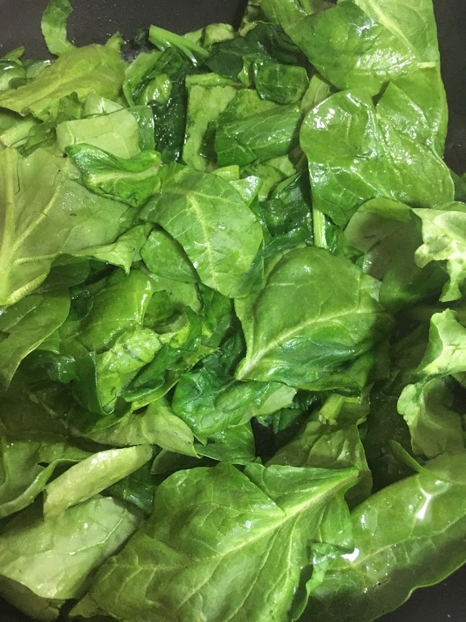 1 yema de huevo cocida.Primero se rehogan las espinacas en 1 cucharada de aceite de oliva en una sartén con una pizca de sal y pimienta. Parece que no van a caber, pero enseguida se consumen y se quedan en nada.
