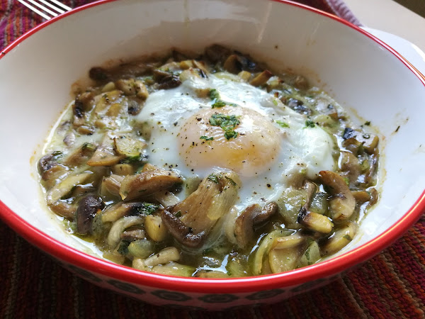 - Poner un huevo encima de cada cazuelita, salar y hornear (180º) unos minutos. Sacar cuando veáis que la clara empieza a estr blanca, para que la yema continúe sin cocer.