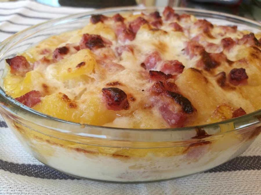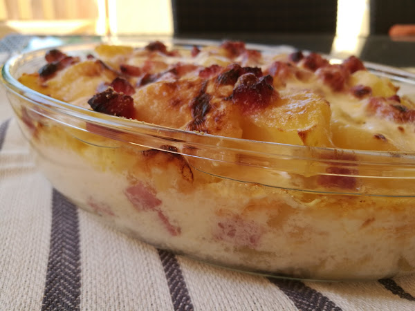 - En una fuente refractaria vamos haciendo capas: patatas, jamón, queso y nata (crema de leche), así sucesivamente hasta rellenar la fuente, regar con la mantequilla y gratinar en el horno unos minutos.