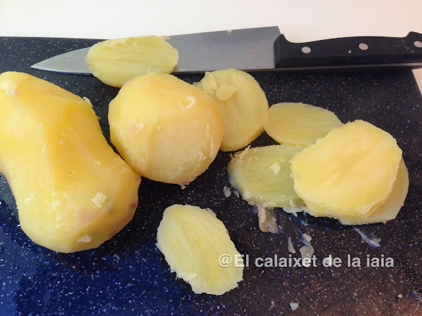 una vez cocidas las patatas, las enfriamos, pelamos y cortamos en rodajas de medio dedo máximo