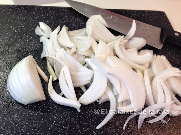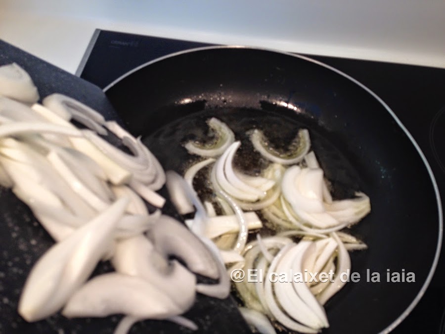 En el aceite de freir los piñones y el bacalao pondremos a pochar la cebolla a fiuego medio, sin que se dore demasiado