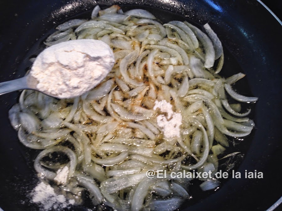Con la cebolla ligeramente dorada pondremos a freir tres cucharadas de harina para que no sepan a cruda, removemos