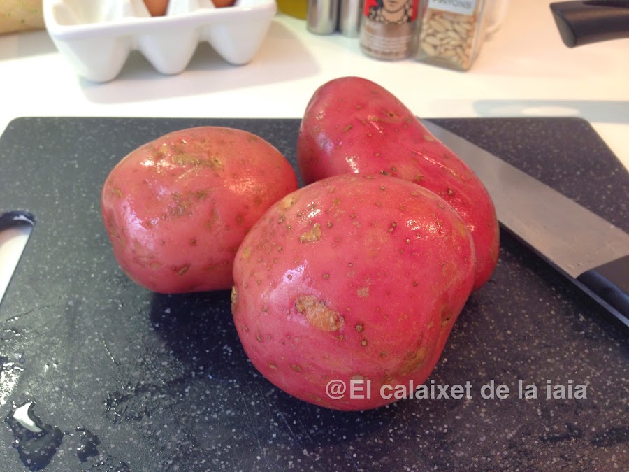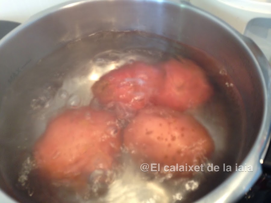 y las ponemos a cocer en agua hirviendo, dependiendo de la clase de patata y del tamaño necesitará unos tiempos, así que iremos comprobando pinchando hasta que las notemos cocidas.