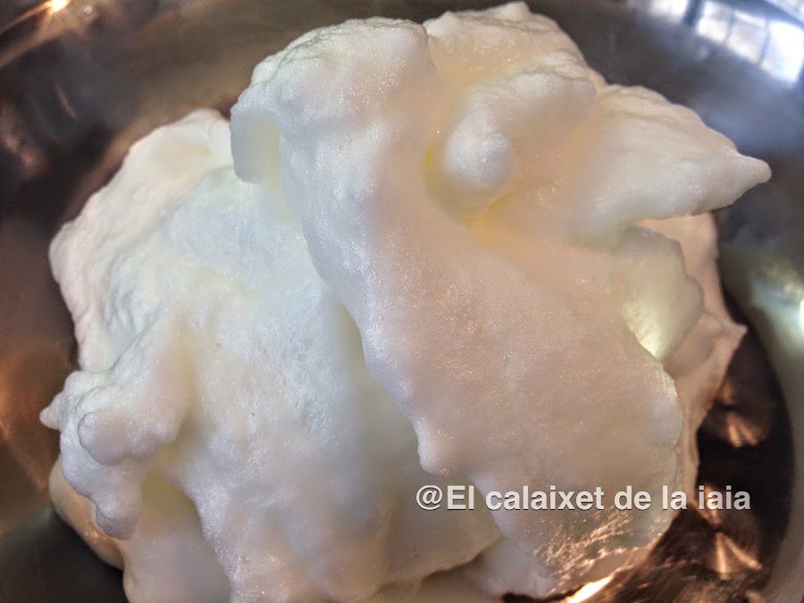 separamos las yemas y con las claras y una pizca de sal, preparamos un punto de nieve fuerte