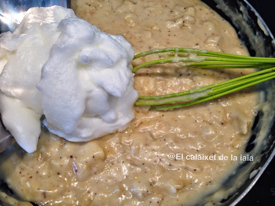 incorporar las claras a punto de nieve mezclando con movimientos envolventes procurando que no se nos baje