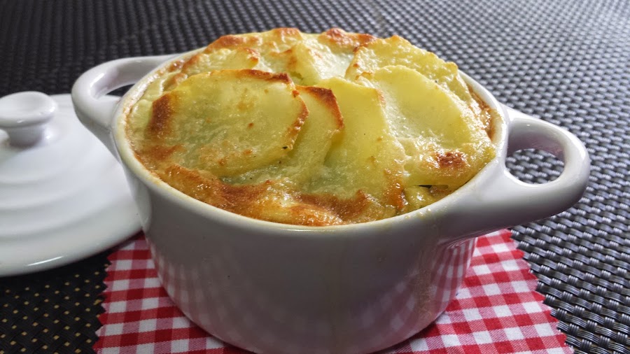 Repartimos la mezcla sobre las patatas y horneamos a 180º durante 40 minutos. Tiene que estar cuajado y la patata dorada. Habremos precalentado el horno previamente