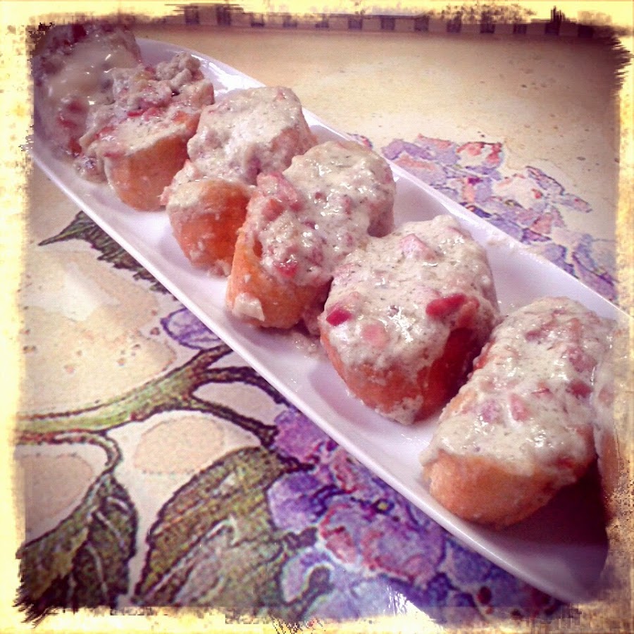 Ahora se puede elegir como prepararlo. O bien lo pones en un cuenco para comértelo en plan dip, acompañado de diferentes panes para untar. O bien como está en la receta, partes varias rebanadas de pan, añades un poco de la mezcla y pones encima unas pocas nueces. No hay que poner demasiada cantidad, pues sino se derrama.